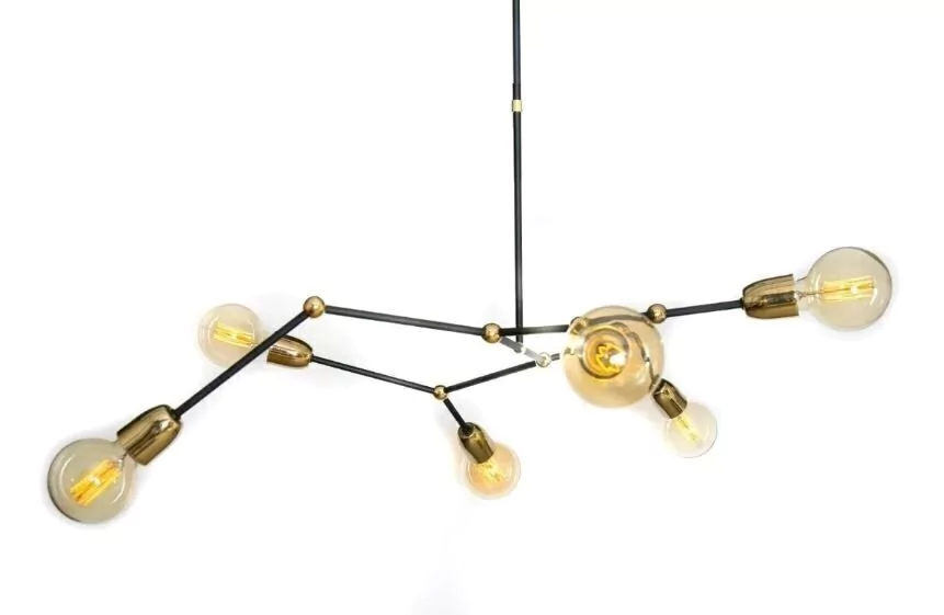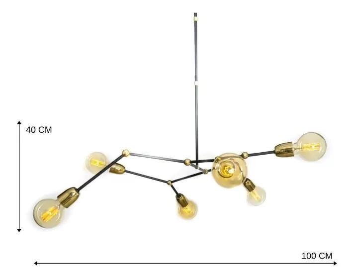 Esta lámpara con seis portalámparas es ideal para dar a los ambientes un estilo lleno de Glamour y sofisticación, siendo totalmente innovadora. Posee detalle únicos como pequeños toques en bronce que la distinguen de las demás. Posee una medida de 1 m de largo x 40 cm de profundidad